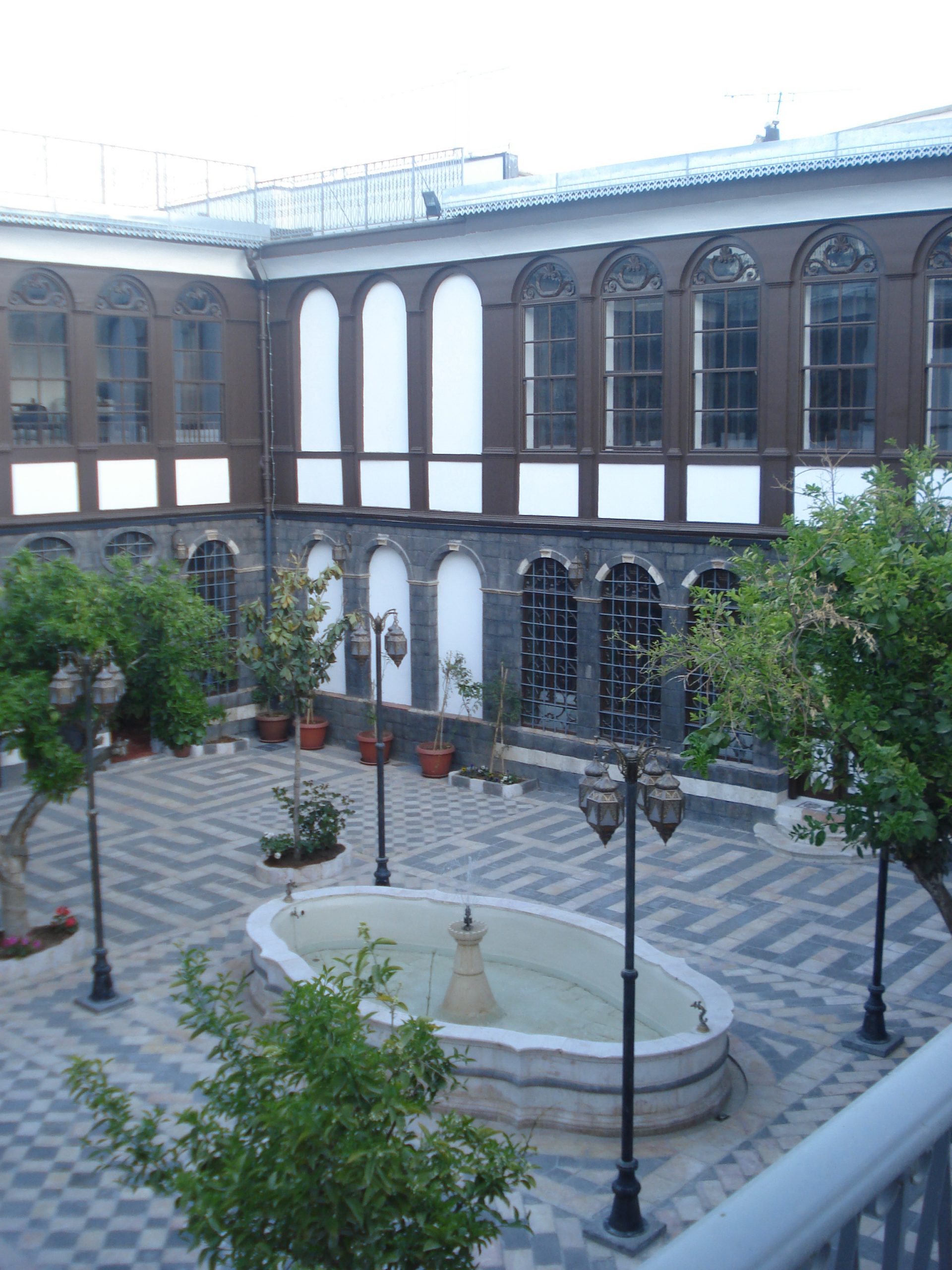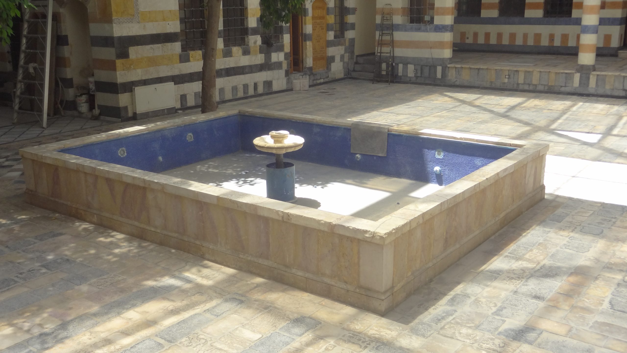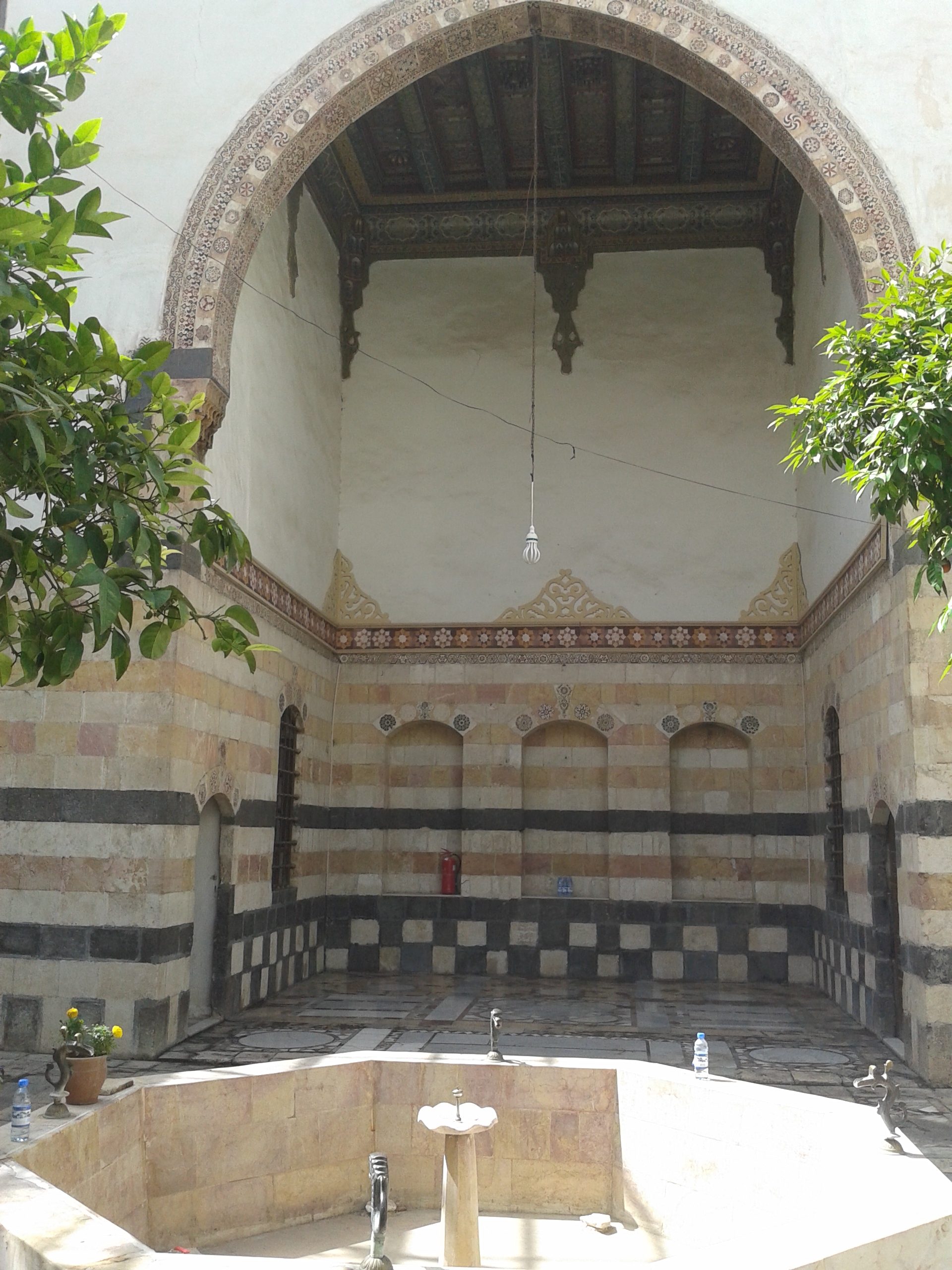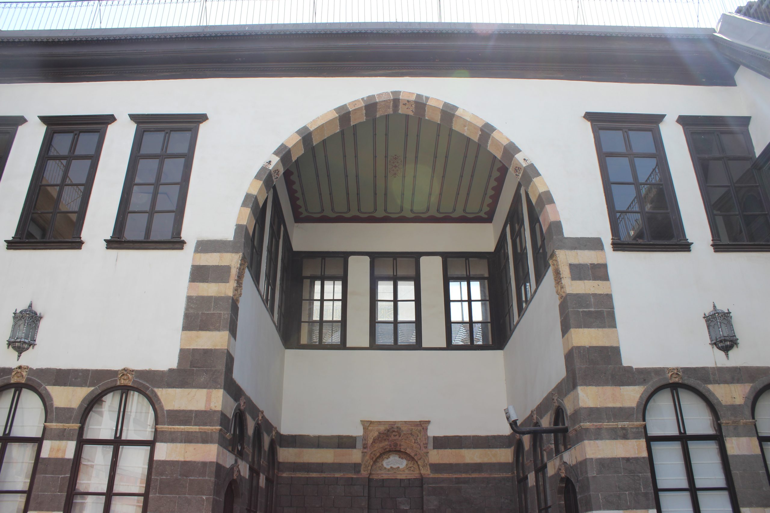 وقد ترك الجزء الأعلى من جدران الإيوان بلون أبيض من الكلسة، ويرتفع الإيوان على مستوى الشريط الضيق المؤدي إلى القاعتين الجانبيتين ويدعى هذا الارتفاع الطزر فقد يرتفع عن أرض الباحة بمقداردرجة أو درجتين للتخفيف من الرطوبة الزائدة نظراً الى انخفاض منسوب الطابق الأرضي وليتمكن الجالس في الايوان من استيعاب فراغ الباحة والواجهات المقابلة منظورياً. وقد شكلت القاعتان الجانبيتان للإيوان الضلعين الاّخرين له حيث بدت النوافذ الزجاجية المناسبة للشتاء وفي أعلاه بدت القماري.