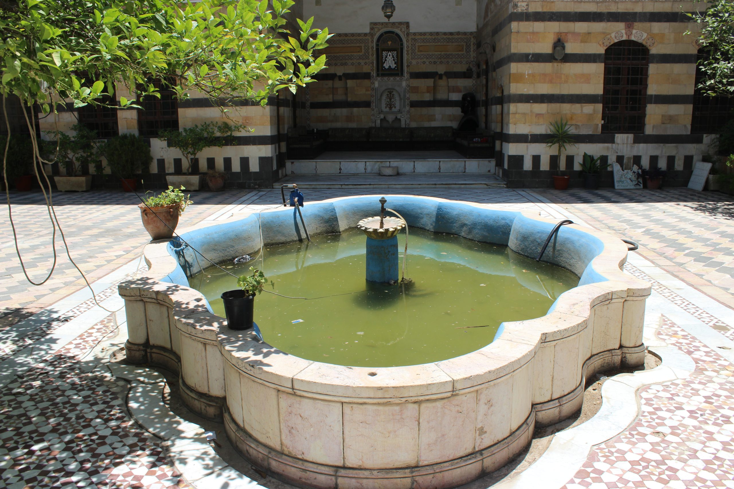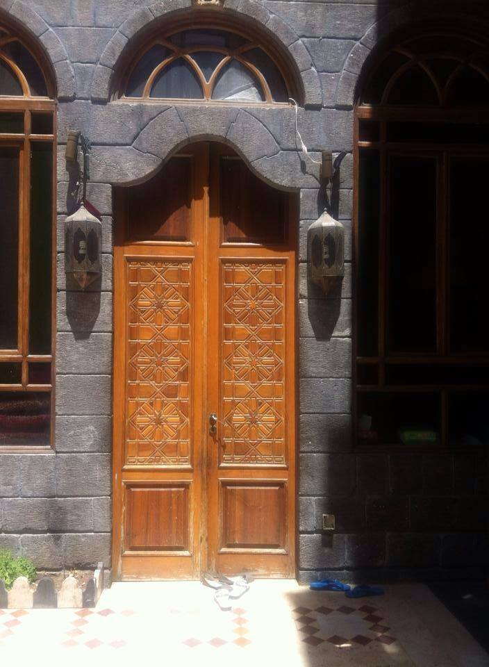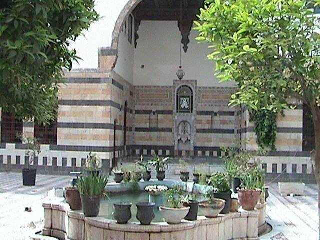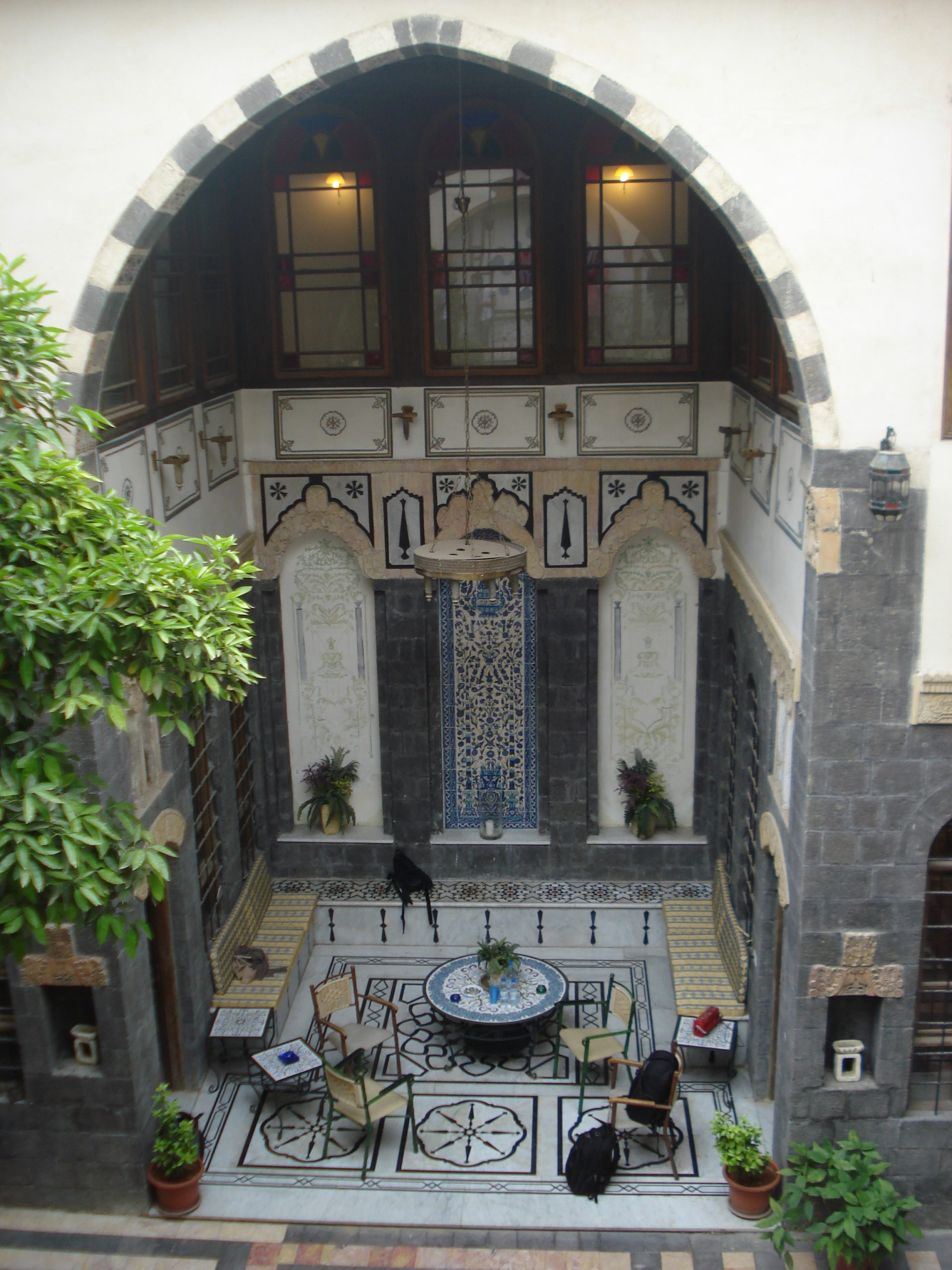 وقد ترك الجزء الأعلى من جدران الإيوان بلون أبيض من الكلسة، ويرتفع الإيوان على مستوى الشريط الضيق المؤدي إلى القاعتين الجانبيتين ويدعى هذا الارتفاع الطزر فقد يرتفع عن أرض الباحة بمقداردرجة أو درجتين للتخفيف من الرطوبة الزائدة نظراً الى انخفاض منسوب الطابق الأرضي وليتمكن الجالس في الايوان من استيعاب فراغ الباحة والواجهات المقابلة منظورياً. وقد شكلت القاعتان الجانبيتان للإيوان الضلعين الاّخرين له حيث بدت النوافذ الزجاجية المناسبة للشتاء وفي أعلاه بدت القماري.