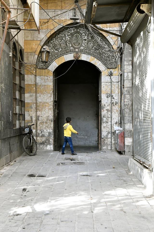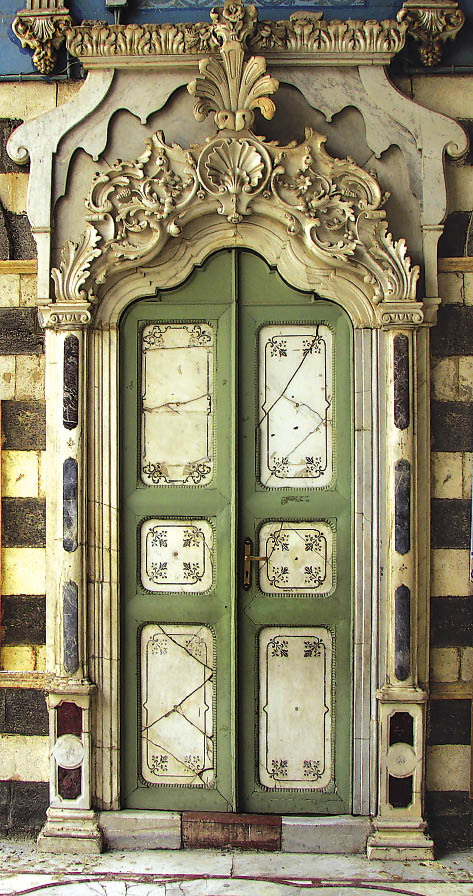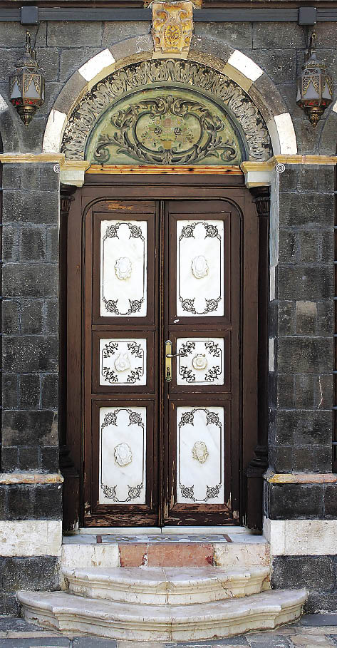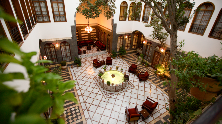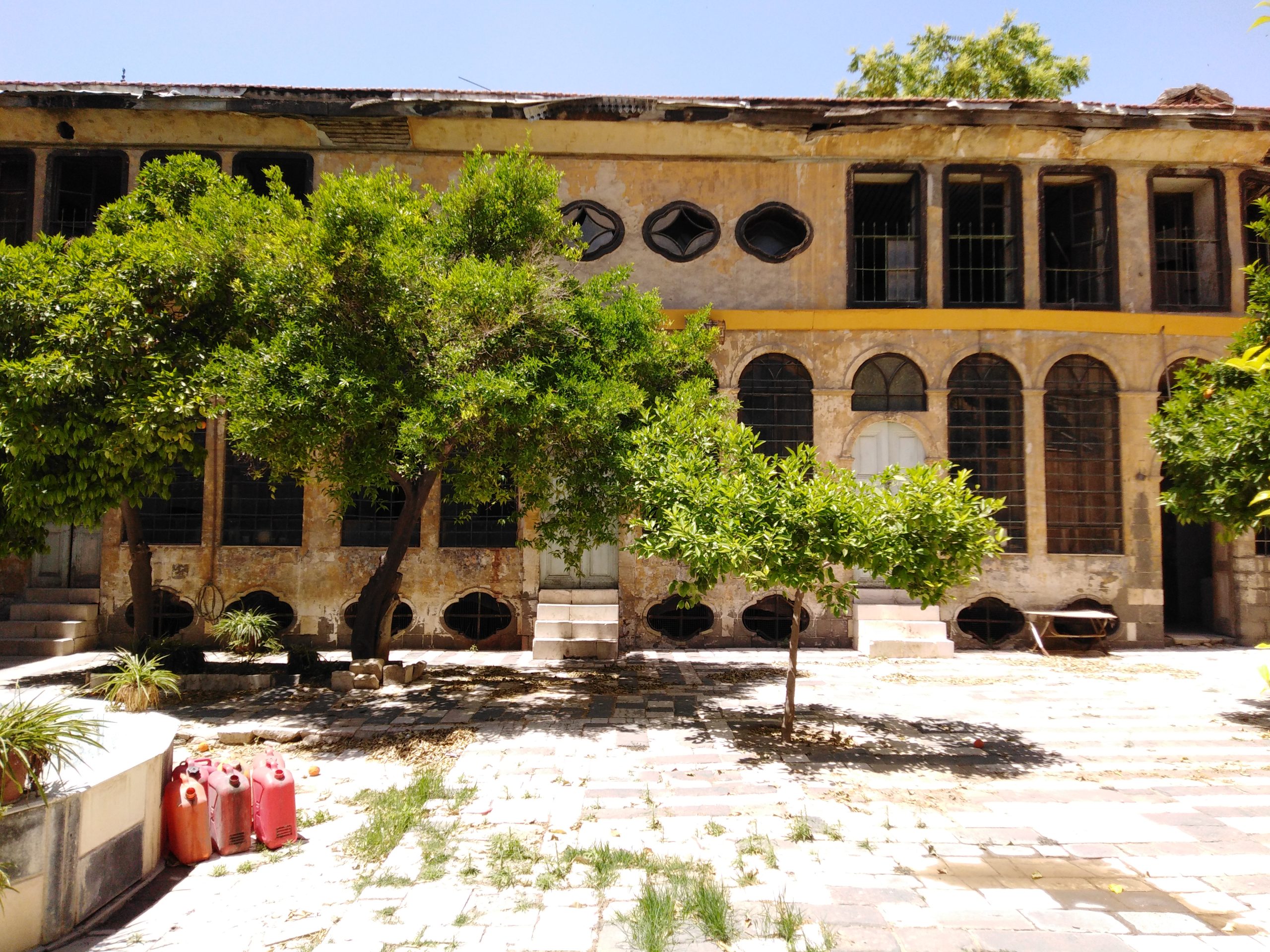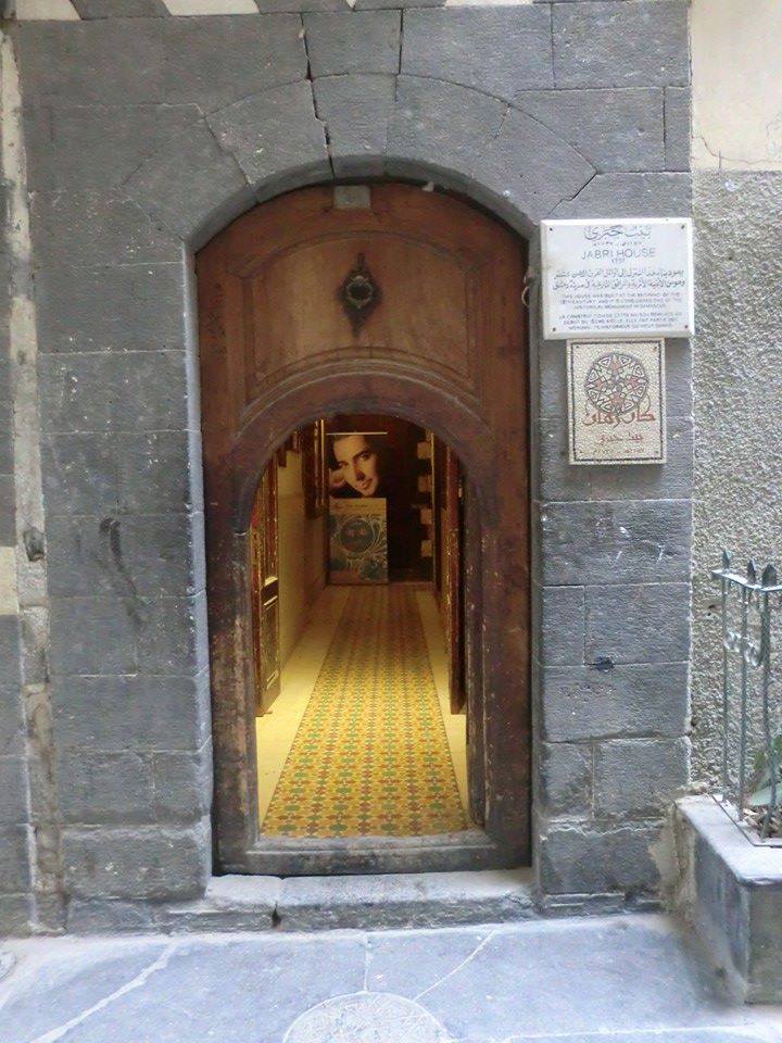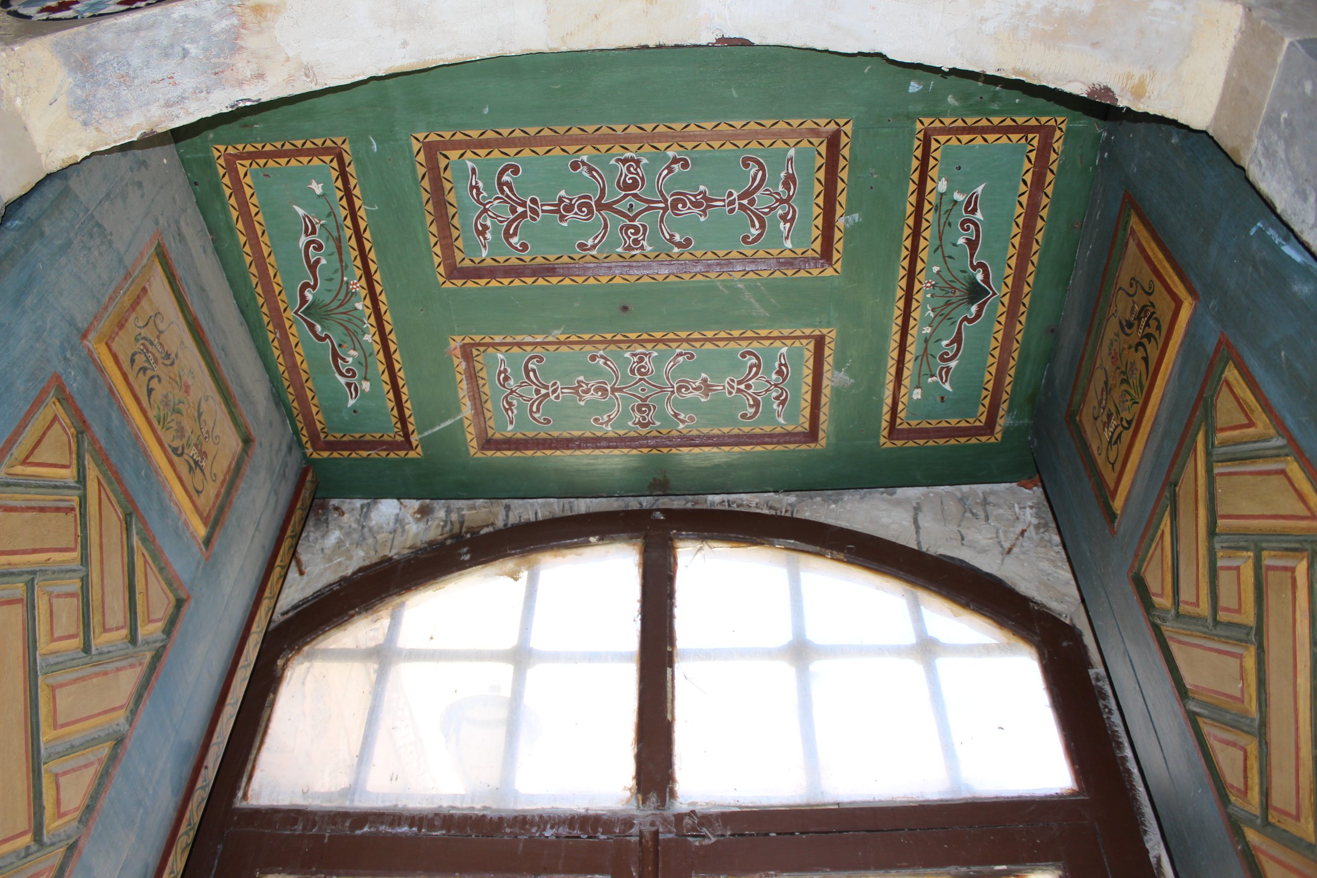 وقد ترك الجزء الأعلى من جدران الإيوان بلون أبيض من الكلسة، ويرتفع الإيوان على مستوى الشريط الضيق المؤدي إلى القاعتين الجانبيتين ويدعى هذا الارتفاع الطزر فقد يرتفع عن أرض الباحة بمقداردرجة أو درجتين للتخفيف من الرطوبة الزائدة نظراً الى انخفاض منسوب الطابق الأرضي وليتمكن الجالس في الايوان من استيعاب فراغ الباحة والواجهات المقابلة منظورياً. وقد شكلت القاعتان الجانبيتان للإيوان الضلعين الاّخرين له حيث بدت النوافذ الزجاجية المناسبة للشتاء وفي أعلاه بدت القماري.